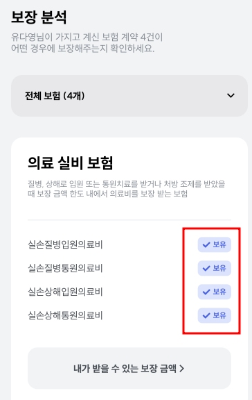 보장분석을 하게되면 어떤보장을 받고있는지 자세한 항목 중에서 보유하고 있지 않은 보장도 한눈에 알 수 있어 내가 어떤 보험의 보장이 부족한지 알 수가 있어 매우 간편합니다. 이 외에도 의료비 청구, 보험상담, 건강검진결과 확인 등 다양한 서비스를 갖고있어 유용한 어플입니다.